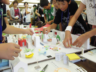 さまざまなアイデアを模型で表現する子どもたち(デザインワークショップ)