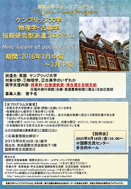 このプログラムは、オケンブリッジ大学 Department of Physics、Faculty of Classicsの協力を得て、博士(後期)課程在籍者若干名を派遣するものです。受け入れ先教員の指導を受けながら、1学期間、非正規生として研究活動を行うことを目的とします。