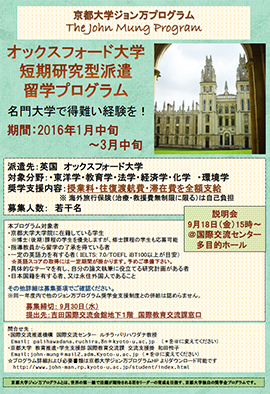 このプログラムは、オックスフォード大学Faculty of Oriental Studies、Department of Education、Faculty of Law、Department of Economics、Department of Chemistry、School of Geography and Environmentの協力を得て、本学博士(後期)課程在籍者を派遣するものです。受け入れ先教員の指導を受けながら、1学期間非正規生として研究活動および資料収集を行うことを目的とします。