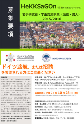 本学が参画・連携運営を行っているHeKKSaGOn(日独6大学コンソーシアム)のドイツ側加盟校との交流事業として若手研究者(博士後期課程学生含む)の短期「派遣」および「受け入れ」の希望者を募集します。