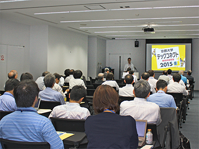 工学研究科は、桂キャンパスイノベーションプラザにおいて、「京都大学テックコネクト(新技術説明会)2015-II 」を開催しました。今回は第4回目の開催となりますが、60名弱とほぼ定員に近い参加がありました。