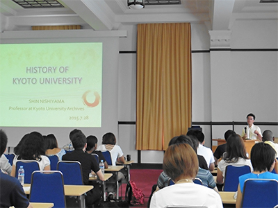 本プログラムは、2014年から7月および9月の年2回行われています。今回の「京都インターンシッププログラム」では、文部科学省の補助事業である「地(知)の拠点整備事業(大学COC事業)」を中心に取りまとめを行いました。西岡加名恵 教育学研究科准教授による「2035年の教育の在り方」、森純一 国際交流推進機構長および西山伸 大学文書館准教授による「「京都市民と京都大学の歴史」、池田聖子 国際高等教育院教授による「街中の美: 京都の看板」、湯川志貴子 国際交流センター准教授による「日本古典文学に見る日本人の美意識」など、2週間の間に数多くの講義を提供しました。