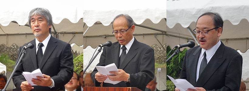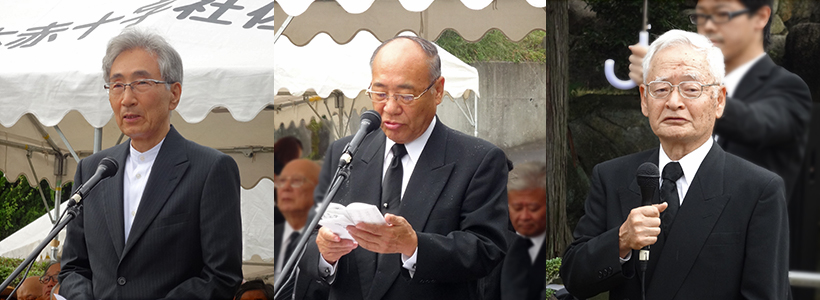 式典では、犠牲者への黙祷の後、山極壽一 総長、上本伸二 医学研究科長、森脇淳 理学研究科長、木村徹 芝蘭会広島支部長、眞野勝弘 廿日市市長が追悼の言葉を述べ、その後に、遺族代表として眞下芳夫 氏が言葉を述べました。山極総長、眞野市長をはじめ参列者全員が献花を行いました。式典の最後には、山極総長から本慰霊の集いに対し永年ご尽力いただいている廿日市市長、廿日市市議会議長、廿日市市大野支所長へ感謝の意をこめて感謝状が進呈されました。 式典後には近隣のホテルにて懇談会が行われました。