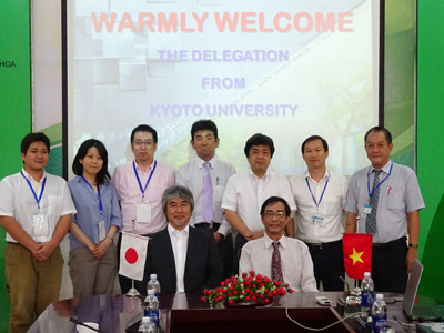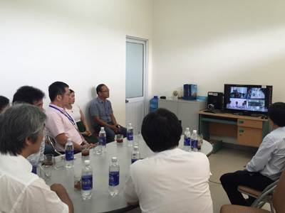 表敬訪問後、同大学内の実験施設などを見学し、地球環境学堂の現地オフィスを訪問しました。現地オフィスでは、地球環境学堂のダナン工科大学での活動が説明され、同じくベトナムで地球環境学堂の現地オフィスを持つフエ、ハノイおよび地球環境学堂(京都)と遠隔会議システム(VCS)で中継する4元会議を行いました。各遠隔局からは、関連教員、ベトナム人学生・修了生、地球環境学舎学生(インターン中の学生も含む)などそれぞれ10名以上が参加し、ベトナムでの研究・教育の活動について積極的な報告が行われました。