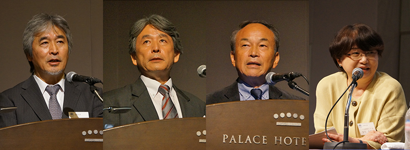左から、挨拶する山極総長、講演する高林教授、講演する阿形教授、パネルディスカッションを進行する吉川教授
