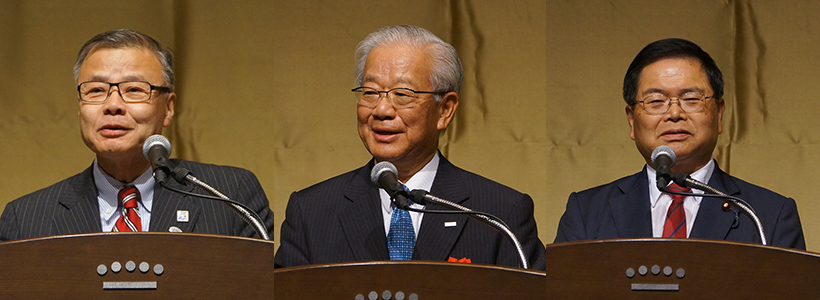 左から、挨拶する土屋次官、挨拶する奥会長、挨拶する竹本議員