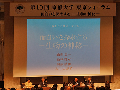 「面白い(おもろい)を探求する -生物の神秘-」をテーマに、第10回京都大学東京フォーラムをパレスホテル東京で開催しました。出席者は約310名で、学外からは本学卒業生を中心とした国会議員、企業、官公庁の関係者等に多く参加いただき、学内からは山極壽一 総長をはじめ、理事・副学長、副理事、部局長等が出席しました。