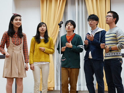 交歓会は、森純一 国際交流推進機構長の司会・進行によって始まりました。山極壽一 総長の開会挨拶では、新しく打ち出した「WINDOW」構想に掲げる六つの目標を紹介するとともに、交歓会が自由闊達な意見交換の場となるよう望むことなどを述べ、会場は和やかな雰囲気に包まれました。続いての乾杯の発声の後は、参加者それぞれの研究内容などをテーマに会場内に談笑の輪が広がりました。今回は、子どもを持つ研究者のために託児室を設けたことにより、夫婦での参加が例年より多く見られました。また、会の途中には、本学学生サークル「CrazyClef」がアカペラを披露し、懇談に花を添えました。