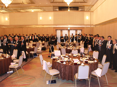 懇親会では、名誉会長の谷本正憲 石川県知事(法学部・1968年卒)から新幹線が開通した金沢を更に発展させていきたい旨の挨拶がありました。続いて、熊谷英彦 副会長(農学部・1964年卒)の乾杯の発声で開宴となり、バイオリンやピアノの生演奏が行れるなか、各テーブルでは昔話に花が咲き大いに盛り上がりました。その後、会員全員で肩を組んで「逍遙の歌」と「琵琶湖就航の歌」を合唱し、最後に中島秀雄 副会長(経済学部・1973年卒)の挨拶により、盛況のうちに閉会となりました。