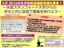 スタンフォード日本センターStanford Japan Center(SJC)が提供する英語講義の受講を希望する本学の学生を募集します。募集は国際交流センターを窓口として行われ、文系理系を問わず応募可能です。SJCは、同志社大学今出川キャンパスにある米国スタンフォード大学が運営する教育機関で、これまで毎年スタンフォード大学から約35名の学生が参加しています。