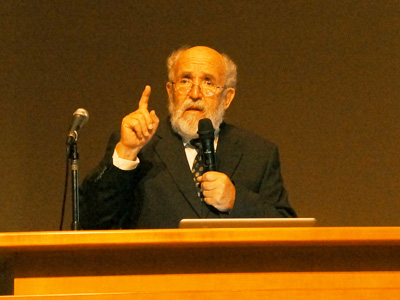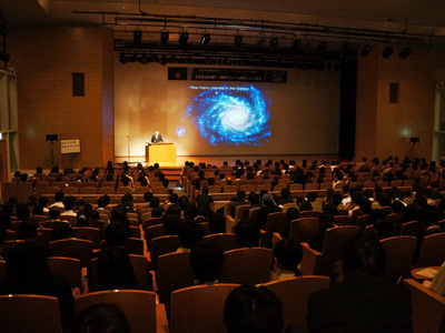 フォーラムでは、檜物常務理事による開会の挨拶の後、マイヨール博士より「宇宙を読み解く:物理学という素晴らしい道具」と題した講演が行われ、出席した京都府内の高校生約450名が熱心に聞き入っていました。