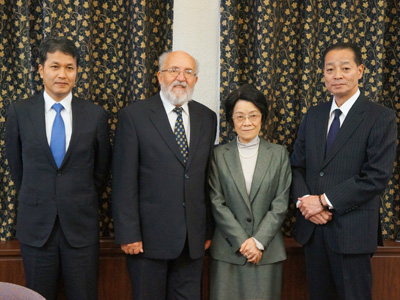 当日はフォーラムに先立ち、京都賞基礎科学部門地球科学・宇宙科学分野受賞者のミシェル・マイヨール 博士と稲葉カヨ 理事・副学長、檜物省一 稲盛財団常務理事、姫田和仁 同事務局長が懇談しました。