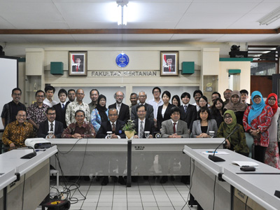 開所式には、IPBから Herry Suhardiyanto IPB学長、Agus Purwito 同農学部長を始め、関係する幹部・教職員・学生が参加しました。本学からは藤井滋穂 地球環境学堂長、宮川恒 農学研究科長、家本太郎 国際交流センター准教授、藤枝絢子 ASEAN拠点副拠点長ら12名の教職員が出席しました。