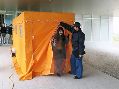 訓練は、初期消火や安否情報伝達、避難誘導、負傷者の救護、また避難状況の集計等、さまざまな場面を設定して行われ、教職員で組織する自衛消防地区隊を中心に、その他の教職員、学生などキャンパス全体で総勢1,000名以上が参加しました。参加者は、各自の役割を確認しながら実践しました。