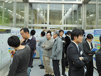 また、共同研究棟ライトコートでは68件のポスター発表を行いました。その後、2014年度の「化研らしい融合的・開拓的研究」に採択された2件の研究課題(中西洋平 化学研究所技術補佐員「高輝度放射光を用いた機能性ポリマーブラシ修飾ナノ微粒子の薄膜形成機構の解明」、磯崎勝弘 同助教「自己組織化単層膜被覆金ナノ粒子触媒における異常加速現象の解明」)の成果報告があり、いずれも活発な質疑・討論が行われました。