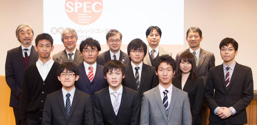 挑戦する学生を応援する新たな学生支援制度SPEC(Student Projects for Enhancing Creativity)。京大生らしい自由かつユニークな発想で、既存の価値観を打ち破るプロジェクトに対し、寄附を募って支援を行うものです。この発表会では、26件の応募の中から採択された6件のプロジェクトについて、学生たちがプレゼンを行いました。 ストローで水を飲んで実演して見せる学生もいて、それぞれのプロジェクトについて、「ここがスゴイ」、「目指すは世界大会1位」と熱く語りました。