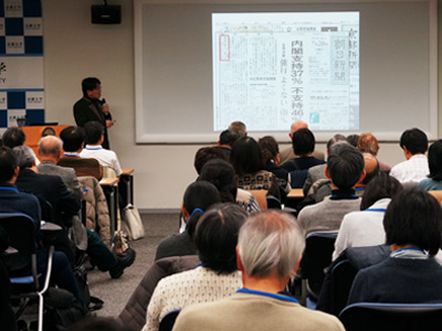 佐藤教授は、安保関連法案をめぐり注目が高まった「民意」、「世論」について話しました。新聞記事を例に挙げながら、「民意」や「世論」が内閣支持率を論拠として報道されることの危うい面やその理由、各紙の見出しや調査の設問の比較などさまざまな視点から語りました。さらに、「輿論(よろん)」と「世論(せろん)」の持つ異なる意味と、その区別が希薄な現状について説明し、それらを識別する民意のリテラシー、つまり、責任ある「意見」なのか、無責任な「空気」なのかを、自ら問う複眼的な思考が必要であると話しました。佐藤教授の講演に、来場者は熱心に耳を傾け、講演後には質疑応答が行われました。