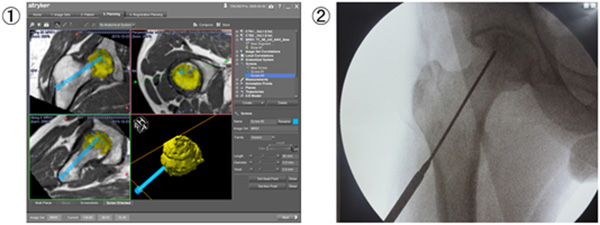 - 術前プランニング画像: 壊死部にbFGF含有ゼラチンゲル製剤を投与する経路を術前にプランニングする。黄色の部分が骨頭の壊死領域、青線が投与経路となる。