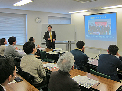 新原雄二 幹事(工学研究科・1993年修了)の司会進行のもと、第1部では技術士制度の説明に続き、各分野で技術士として活躍する、大坪利行 氏(工学研究科・1978年修了・経営工学部門)、龍原毅 氏(工学研究科・1991年修了・建設部門)、田中和明 氏(工学研究科・1982年修了・金属部門)の3名により、それぞれの体験を交えた技術士資格取得のメリットに関する講演がありました。その後、試験制度の説明と京都大学技術士会の設立趣旨・活動状況説明がありました。