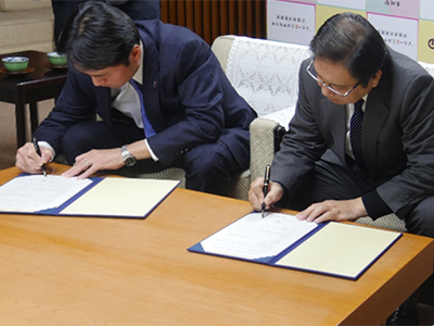 協定書にサインする尾崎知事(左)と寶所長(右)