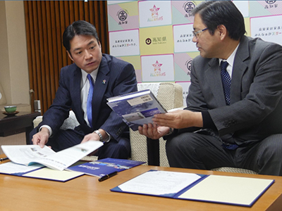 連携協定締結後に握手を交わす尾崎知事(左)と寶所長(右)