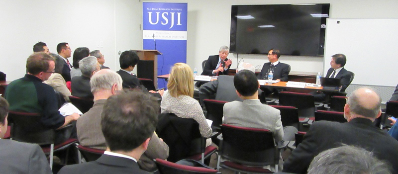 本学からは、USJI副理事長を務める森純一 国際交流推進機構長、原良憲 経営管理研究部教授が参加、さらにゲストスピーカーとして、Glen S. Fukushima 米国先端政策研究所上級研究員を迎え、「Rejuvenating Japan's Economy and Industries. - Abenomics in the Long Run」(日本経済の復活 -アベノミクスの長期展望)と題したセッションを実施しました。