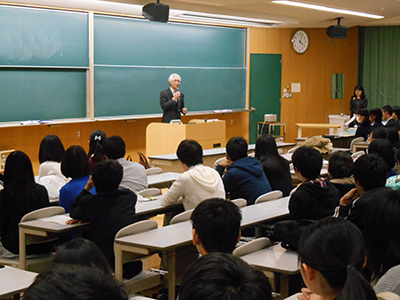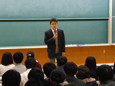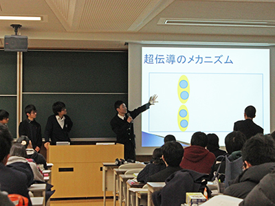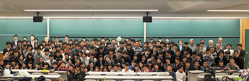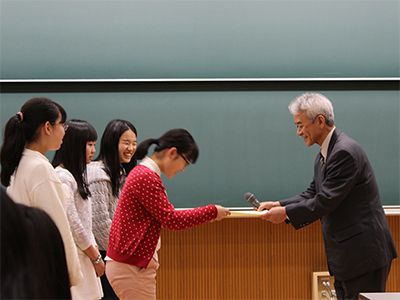 当日は、2015年9月から2月まで受講した基盤コース受講生(146名中135名)が、探究の成果について、各分野2チームに分かれて成果発表会を行いました。北野正雄 理事・副学長が全体講評を行った後、優秀な発表を行ったチームには、受講生の投票と教員による総合評価をもとにプレゼンテーション賞を決定し、(プレゼンテーション賞受賞: ロボット聴覚、物理学、土の物理、地球環境学 I 、昆虫の生態と化学、海洋生物資源の科学の各チーム)表彰式が行われ、天野洋 農学研究科教授より記念の賞状を贈呈しました。