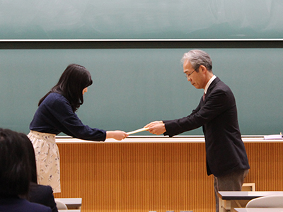 最後に基盤コース修了式を行い、有賀副学長による開会挨拶のあと、修了証が各分野の代表者に授与されました。