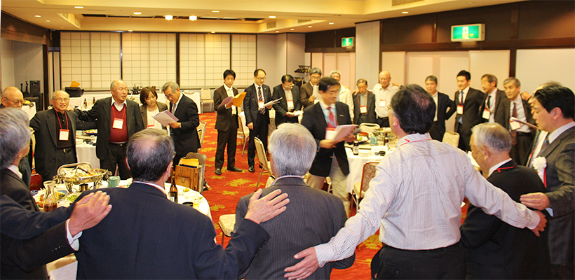 講演会終了後の総会では、徳賀芳弘 副学長(京都大学同窓会代表幹事)による挨拶のあと新役員の紹介が行われました。その後会場を移して同窓生による懇親会が古谷俊夫 前会長(文学部・1952年卒)の乾杯で開宴となり、会員相互の交流が深められ、盛況のうちに会員全員で「琵琶湖周航の歌」を合唱し、閉会となりました。