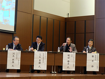 はじめに、奥野信宏 中京大学学術顧問が、「民間が公共になる」をテーマにした基調講演を行いました。続いて、保井美樹 法政大学現代福祉学部教授をコーディネーターとして、堀田勝彦 錦二丁目まちづくり協議会長、三石秀樹 株式会社飯田まちづくりカンパニー取締役事業部長、河木照雄 豊田まちづくり株式会社代表取締役、藤井修 名古屋駅地区街づくり協議会事務局長の4名をパネリストとして迎え、「エリアマネジメントのネットワーク」をテーマとして、トークセッションを行いました。前半は、各団体のエリア内のネットワークを活用した取り組みやその成果、課題などを紹介しました。後半は、制度のブレイクスルー、合意形成、資金、人材育成など、ネットワークを活用した事業の課題や、その解決に向けた全国エリアマネジメント団体の連携・学び会いの機会に対する期待等について活発な意見が交わされました。