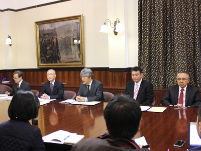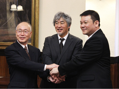 左から、立本成文 人間文化研究機構長、山極壽一 総長、 Nazir Foead インドネシア共和国泥炭復興庁長官
