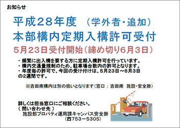 本学では、頻繁に出入構を要する方に対して、事業年度ごとに定期入構許可を行っています。今回、学外の方を対象に、追加で本部構内の定期入構許可証を発行することとしました。構内交通量規制のため、駐車場台数内の許可となります。