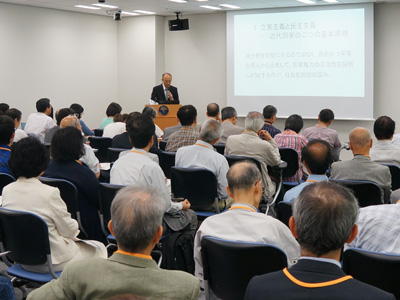 毛利教授は、まず、立憲主義と民主主義という近代国家の二つの基本原理について話しました。アメリカ合衆国憲法やフランス人権宣言などにも触れながら、19世紀頃からの憲法によって権力行使を規律することが文明国の証とされていったこと、第2次世界大戦後に、人権思想が普遍的妥当性を持つという考え方が広がったことなど、歴史的、国際的な視点から説明しました。そして日本国憲法もその流れの中で生まれたものと理解すべきとしながら、日本国憲法の特徴である9条の平和主義、戦力の不保持などについて、今日的な憲法問題である集団的自衛権と合わせて論じました。さらに、ヘイトスピーチに関して、その規制と合憲性について、立憲主義憲法の普遍的規定である表現の自由との関係から話しました。