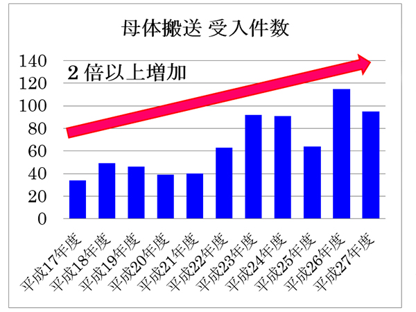 医学部附属病院ではこれまで、産婦人科外来通院中の妊婦さんはもちろんのこと、京都府下および他県から、重症の妊婦さん、産褥期の患者さんを「母体搬送」として産科分娩部で受け入れてきました(グラフ参照)。受け入れ件数はこの10年で2倍以上に増加してきています。このたびMFICUを開設してさらに充実した診療体制を確立し、「母体搬送の全例応需」という原則のもと、地域の周産期医療に貢献していきます。