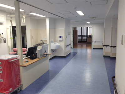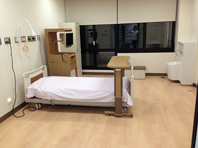 MFICUは、いずれも1室あたり17~19m 2 (施設基準15m 2 )と非常に広い床面積を確保して、患者さんのストレスを減らせるよう配慮しています。また重症妊産婦さんあるいは産褥婦さんに対しては、頻回の胎児心拍数モニター、母体バイタルサインモニター(血圧・脈拍など)、あるいは超音波(エコー)検査を含む診察が必要となってきますが、広い個室では医療機器を入れやすく、ベッドサイドで直接、スムーズに診療にあたることができるようになっています。