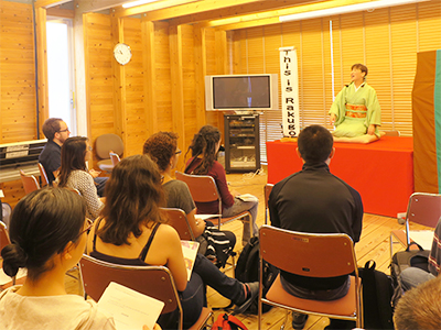 関西で活躍されている女性落語家の小夜姫さんに、落語やその成り立ちについての簡単な解説をしていただいたあと、「転失気」という演目をパワフルに演じていただきました。「転失気」は和尚と小僧の掛け合いも楽しく、参加者からたくさんの笑い声が沸き起こりました。演目の後は、参加者たちも小咄を練習し、実際に高座に上がって披露するなど、盛りだくさんの内容でした。