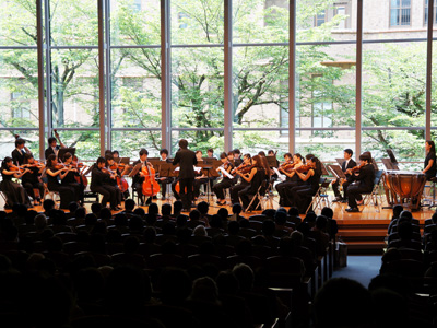 京都大学と京都市立芸術大学が主催して毎年開催しているクロックタワーコンサートを、百周年時計台記念館にて開催しました。今回は、「レクチャー&コンサート モーツァルト生誕260年記念 今日1日でモーツァルトの全てがわかる -交響曲からオペラまで-」と題し、柿沼敏江 京都市立芸術大学音楽学部教授をナビゲーターに、増井信貴 同教授のトークも交えて行われました。前半では、私たちに馴染みのある「フィガロの結婚」序曲、交響曲第1番、アイネ・クライネ・ナハト・ムジーク第1楽章などが、同大学アカデミーオーケストラ(大学院管弦楽団)により演奏されました。後半は、同大学大学院オペラ演習履修生も加わって、オペラ「魔笛」の序曲とアリアが披露され、出演者の情感たっぷりの演技と歌に、ほぼ満員のホールは熱気に溢れ、楽しいコンサートとなりました。