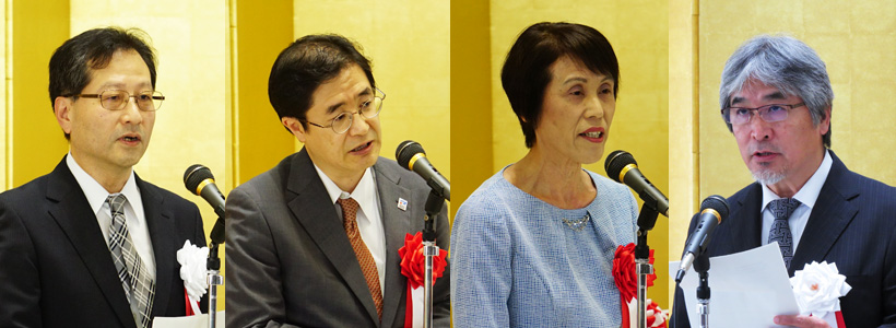 左から、式辞を述べる宮川研究科長、挨拶する松尾大臣官房審議官、河井市長、山極総長