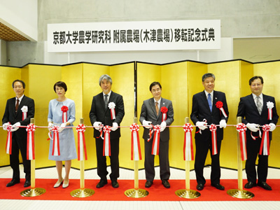 テープカットの様子(左から、冨永達 農学研究科附属農場長、河井市長、山極総長、松尾大臣官房審議官、山下晃正 京都府副知事、宮川研究科長)