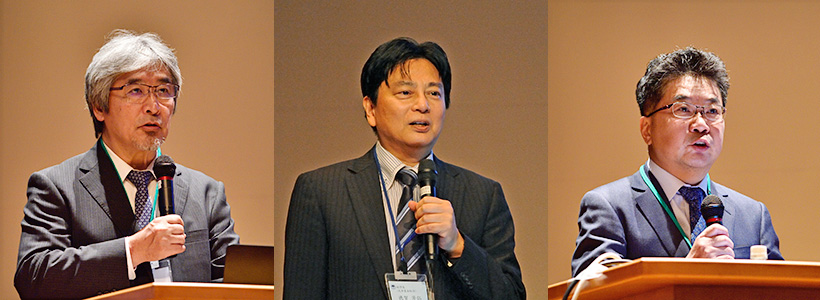左から、挨拶する山極総長、基金の活動報告をする徳賀副学長、講演する森教授