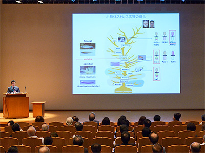 続く講演会では、森和俊 理学研究科教授が「私の研究者人生と京都大学」と題した講演を行いました。「アメリカのノーベル生理学・医学賞」と呼ばれ米国医学会最高の賞である「アルバート・ラスカー基礎医学研究賞」を2014年に受賞したのをはじめ、2016年の恩賜賞・日本学士院賞など、数々の有名賞の受賞歴を持つ森教授が、研究者としての歩みや、研究テーマである「小胞体ストレス応答」について紹介しました。参加者は熱心に聞き入り、「細胞がタンパク質の異常を検知するために対処法を備えているなんて」と驚きの様子でした。
