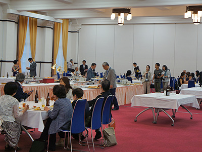 その後、場所を2階の国際交流ホールに移した懇親会では、山極総長をはじめ本学の理事・副学長等、プロジェクト支援基金に関わる教職員が参加者を迎え、和やかな雰囲気のなか歓談しました。懇親会場には、各プロジェクト支援基金のブースを設け、パンフレットやポスターを設置、スタッフが待機しているブースもあり、研究者や学生が自分たちの活動を紹介するなど、参加者との交流を深めていました。