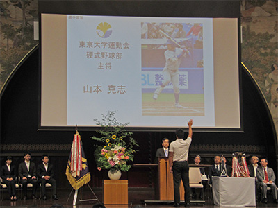 また、午後に開催された七大戦開会式には、山極壽一 総長、川添信介 理事・副学長、守屋和幸 体育会長も参加しました。2015年度優勝校の東北大学による優勝旗・優勝杯の返還や、2016年度主管校である東京大学硬式野球部主将による選手宣誓が行われた後、大会マスコット「イチ公」の紹介や、東京大学柏葉会合唱団による合唱、東京大学応援団による演舞演奏が披露されました。