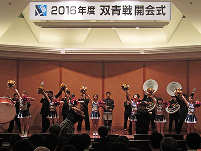 午前中に行われた双青戦の開会式では、両大学の応援団による力強い演舞演奏が披露され、お互いの健闘を誓い合いました。