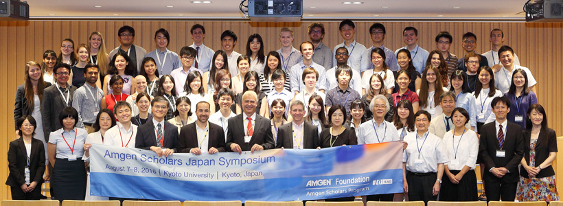このシンポジウムは、米国アムジェン財団の寄附により、「米国、欧州および日本の世界トップレベルの17教育・研究機関において、夏休み中に実施される研究体験を通して次世代を担う若手研究者を育成する」という趣旨のもと行われています。日本では本学および東京大学において実施されているアムジェン・スカラーズ・プログラムの一環として、両校でプログラム参加中の学生らが一堂に会し、開催されました。シンポジウム前日には、本学と東京大学の参加学生が、互いの親睦を深めるため、伏見稲荷を観光しました。