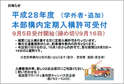本学では、頻繁に出入構を要する方に対して、事業年度ごとに定期入構許可を行っています。今回、学外の方を対象に、追加で本部構内の定期入構許可証を発行することとしました。構内交通量規制のため、駐車場台数内の許可となります。