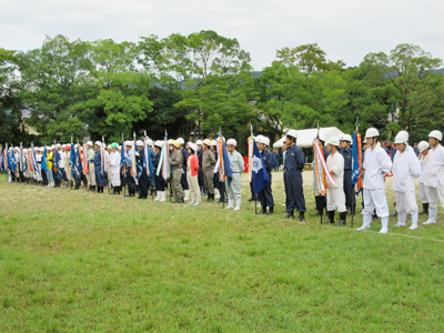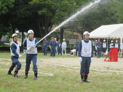 当日は、朝からの雨も上がった訓練日和で、他の左京区管内の自衛消防隊と、日頃の訓練成果を披露するとともに自主防火・防災の必要性について再認識しました。