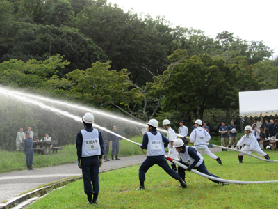 宝が池公園北園において第44回左京自衛消防隊訓練大会が開催されました。本学は吉田キャンパス自衛消防隊本部隊から屋外消火栓操法に2チーム、医学部附属病院自衛消防隊から屋内消火栓操法に3チームが出場しました。