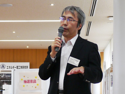 また、交流会コアタイムには、宇治地区研究所の所長らも参加し、渡邊隆司 生存圏研究所長の挨拶の後、西上欽也 防災研究所副所長、青山卓史 化学研究所副所長の紹介と挨拶がありました。その後、参加者の自己紹介タイムが設けられ、引き続き行われた電化製品等の抽選会で会場は大いに盛り上がりました。