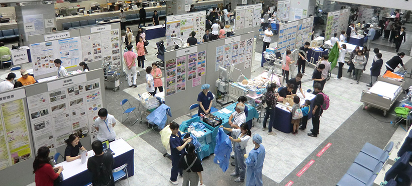 当日は、各診療科(部)の取り組みを紹介する「パネル展示」をはじめ、リハビリテーション部の筋力テストや検査部の頸動脈エコー体験、看護部のヘッドマッサージなどの「体験コーナー」、さらに医学部附属病院への就職希望者を対象にした「就職相談コーナー」や「見学ツアー」などさまざまな企画を実施し、将来医療の道に進みたいと考えている学生さんから近隣住民の方まで、たくさんの方にお越しいただき、各部の取り組みや業務について知っていただくことができました。